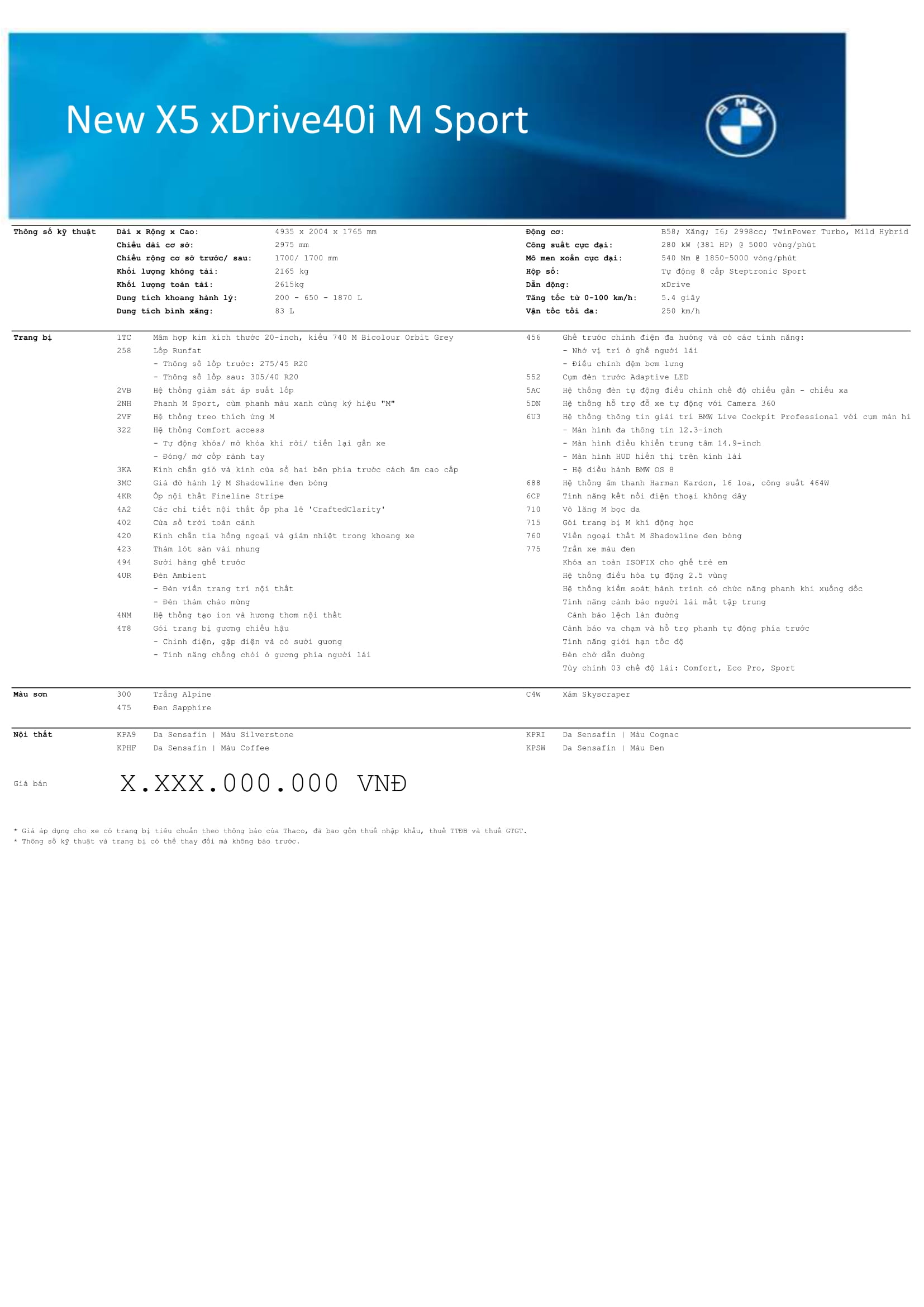 | X5 xDrive40i xLine: | 3.796 tỷ đ |