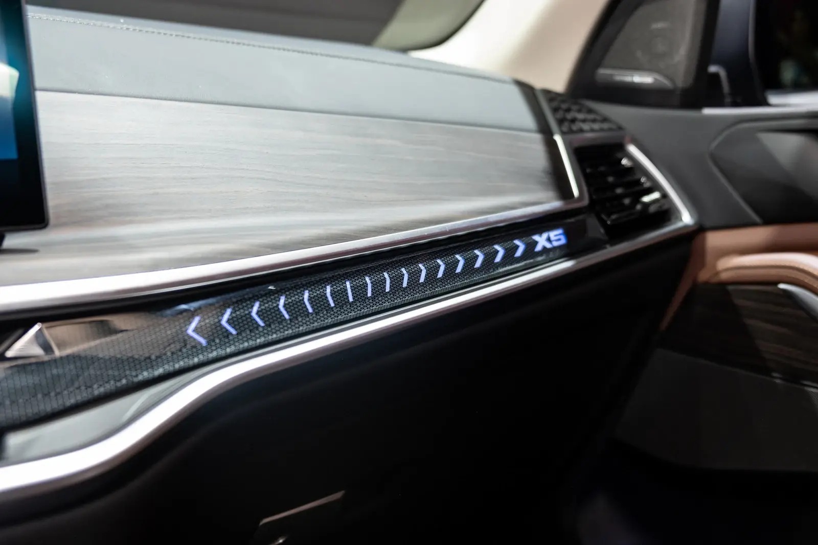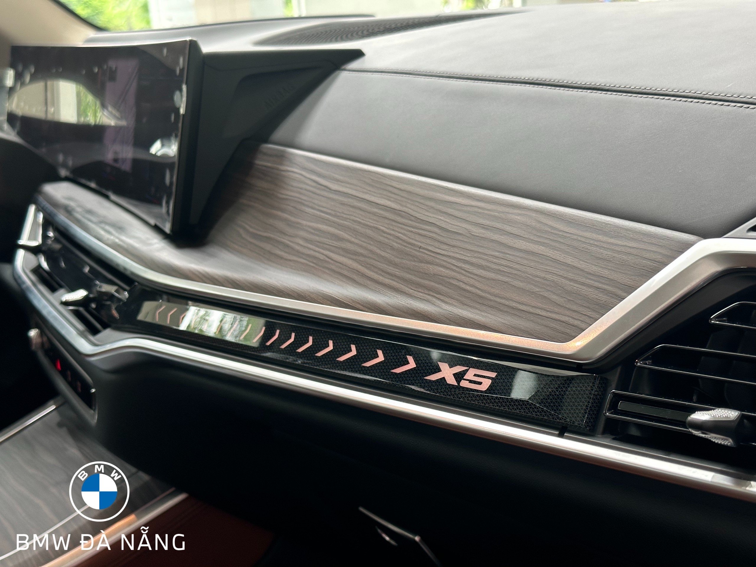 Thanh BMW Interaction Bar với logo X5 đặc trưng cùng hiệu ứng ánh sáng bắt mắt dạng mũi tên tích hợp hệ thống đèn viền nội thất Ambient Light điều khiển ánh sáng tạo trải nghiệm không gian nội thất độc đáo.