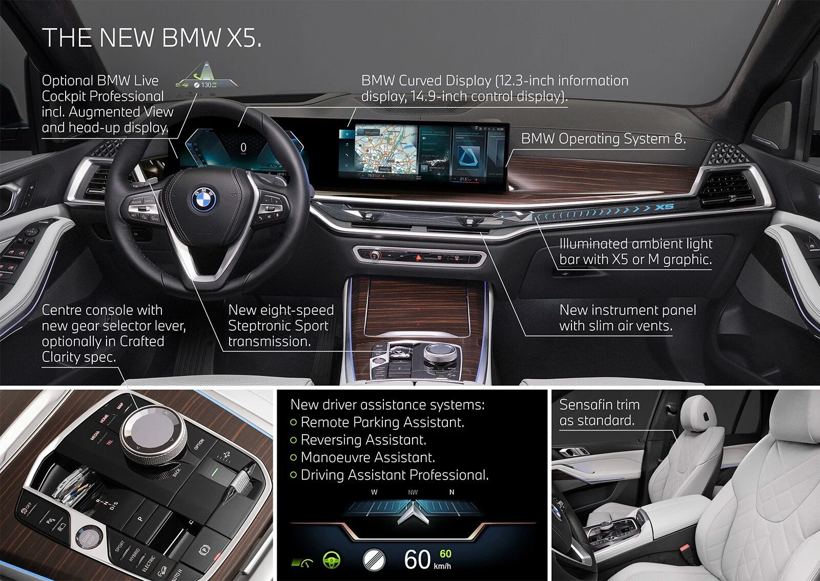 Một số trang bị đáng chú khác ở nội thất X5 mới còn có âm thanh Harman Kardon, điều hoà tự động 4 vùng trên bản xLine, 2,5 vùng trên bản M Sport, cửa sổ trời toàn cảnh... Bản xLine được bố trí 7 chỗ ngồi, có cửa hít, còn bản M Sport chỉ có 5 chỗ. Cả 2 bản đều dùng ốp gỗ nội thất, chỉ khác ở gỗ bóng trên bản M Sport và gỗ nhám trên bản xLine. Da ghế được nâng cấp loại cao cấp hơn.