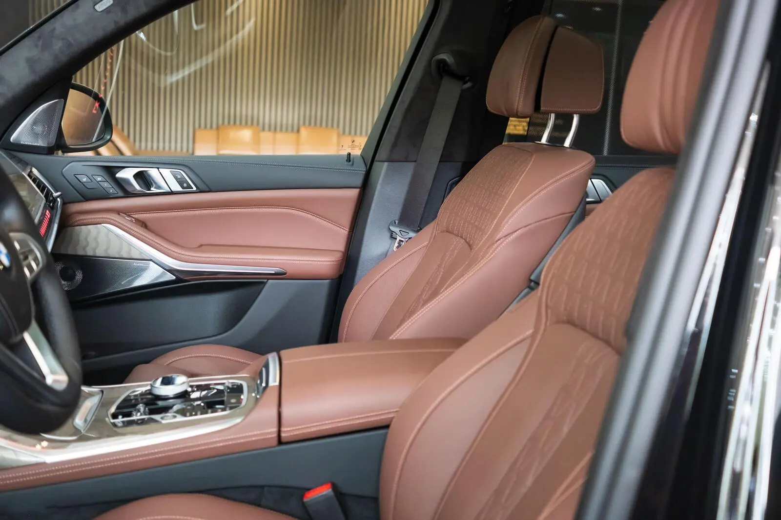BMW X7 LCI hoàn thiện nội thất với bộ ốp vân gỗ màu gray, đây là một trang bị cao cấp trong nhóm Individual của BMW. Ghế ngồi toàn bộ bọc da Merino, một loại da cao cấp nhất mà BMW đang sử dụng trên những chiếc xe của họ.