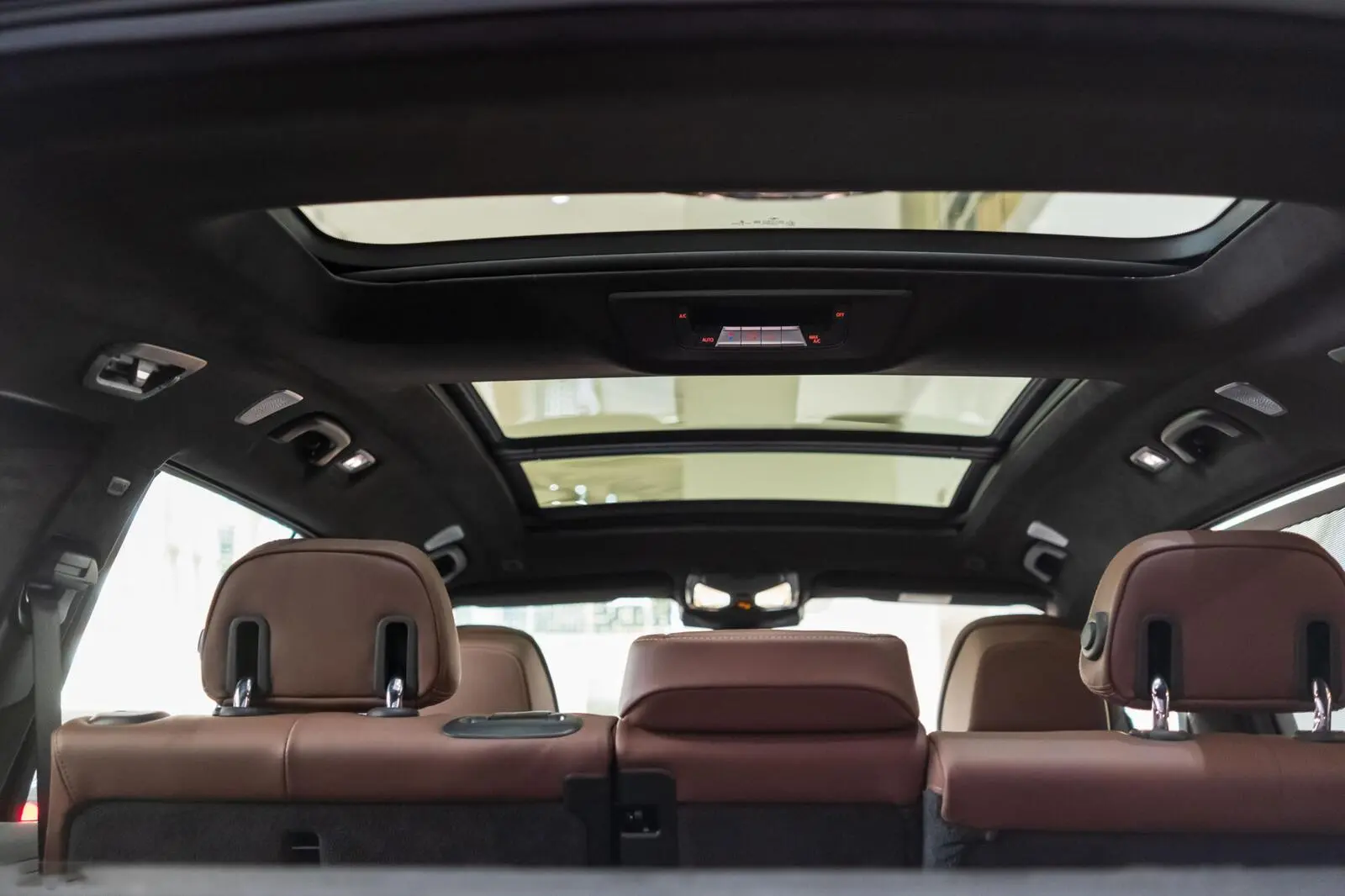 Ngay cả hàng ghế cuối cùng cũng được trang bị cửa sổ trời cố định. Hiện tại trong phân khúc, X7 là mẫu xe duy nhất trang bị cửa sổ trời cho cả 3 hàng ghế. Hàng ghế giữa được chăm sóc chu đáo hơn với 2 rèm che nắng chỉnh điện, tính năng chỉnh điện, sưởi ấm, thông gió, nhớ vị trí và massage nhiều chế độ.